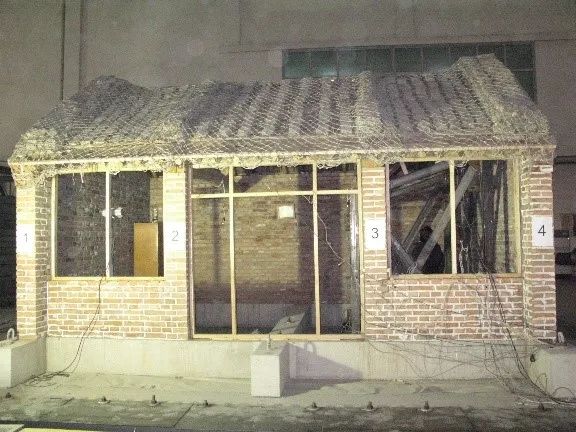 选取图7所示纪晓东等开展的单层未设防砌体结构振动台试验模型,输入典型台站记录,分析结果表明该结构将处于中度破坏状态。(纪晓东等,北京市既有农村住宅砖木结构加固前后振动台试验研究,建筑结构学报,2012,11,53-61.)